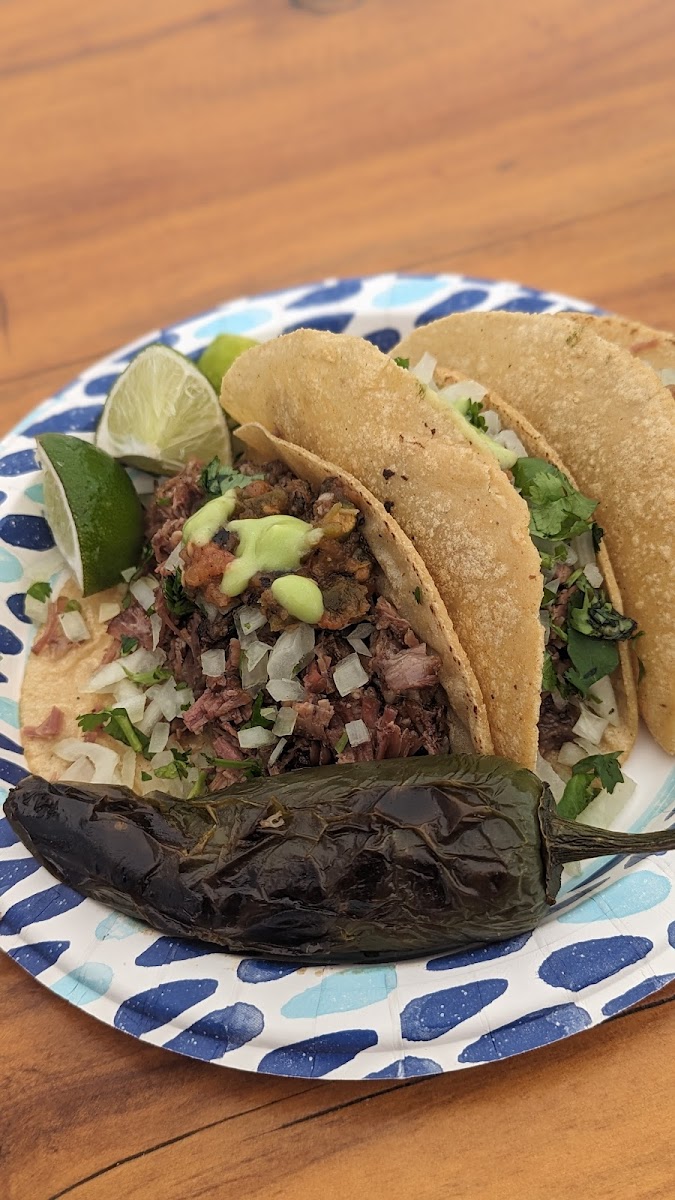 “ Tasty Mexican food Truck although the menu is pretty limited. Tacos and quesadillas. They offer several salsas and garnishments. Tented dine there option. Prices are average to a little high. ”